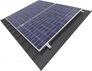 Kompletný nosný systém, ktorý umožňuje montáž ľubovoľného počtu fotovoltaických panelov vo vertikálnom usporiadaní na šikmú strechu pokrytú falcovanou krytinou.